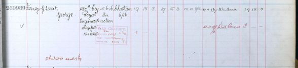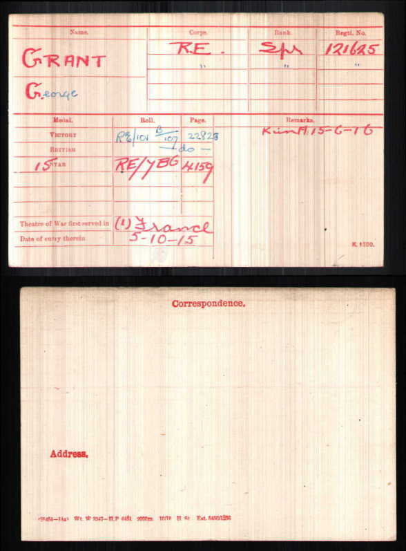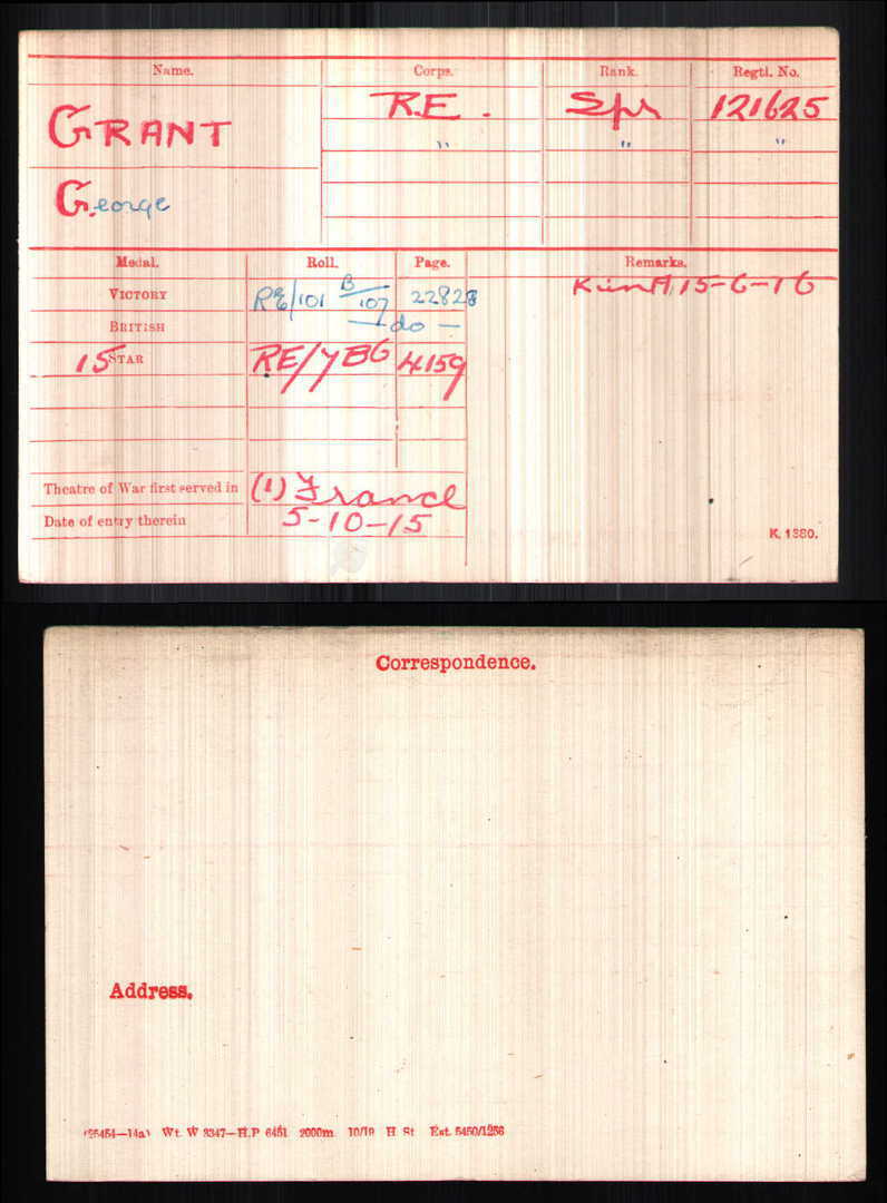 GEORGE GRANT joined The Royal Engineers as Sapper 121625, and went to France on 5th October, 1915.