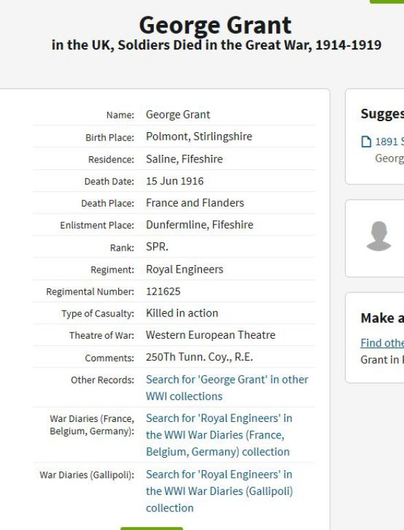 The entry in Soldiers Died in the Great War (SDGW) shows that GEORGE GRANT was born at Polmont, Stirlingshire, was resident at Saline, Fife, and enlisted in Dunfermline.