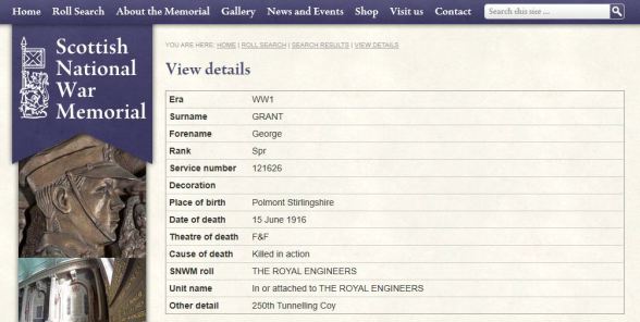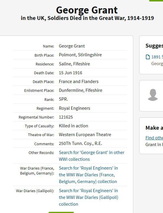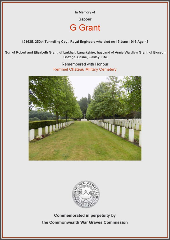 GEORGE GRANT, Sapper 121625, 250th Tunnelling Company, The Royal Engineers, is NOT named on the Larkhall War Memorial. He was a Mining Engineer, and this made him a very qualified candidate to serve in The Royal Engineers.