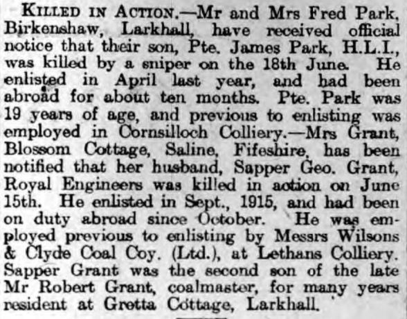 - Mrs Grant, Blossom Cottage, Saline, Fifeshire, has been notified that her husband, Sapper Geo. Grant, Royal Engineers, was killed in action on June 15th. He enlisted in Sept., 1915, and had been on