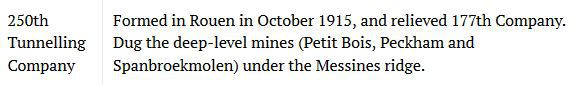 Mining knowledge and expertise were needed by the Royal Engineers and GEORGE GRANT was posted to the 250th Tunnelling Company of the Royal Engineers. The 250th Tunnelling Company was formed at Rouen, France, in October, 1915, and relieved the 177th Tunnelling Company. The 250th dug the deep-level mines ('Petit Bois', 'Peckham' and 'Spanbroekmolen') under the Messines Ridge.