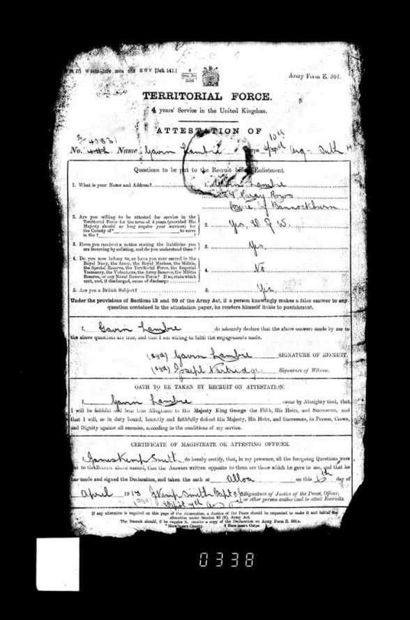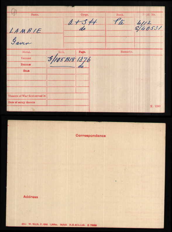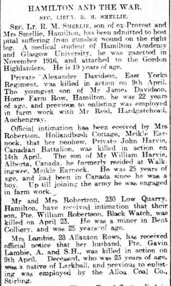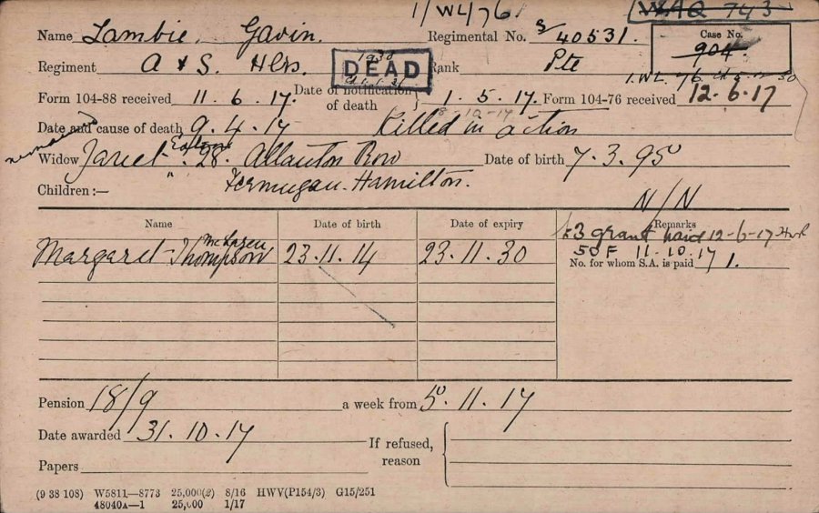 Mrs Lambie, 28 Allanton Rows, has received official notice that her husband, Pte Gavin Lambie, A. and S. H., was killed in action on 9th April. Deceased, who was 23 years of age, was a native of