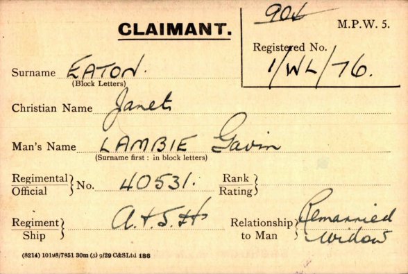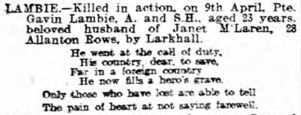 "LAMBIE - Killed in action, on 9th April, Pte Gavin Lambie, A. and S. H., aged 23 years, beloved husband of Janet McLaren, 28 Allanton Rows, by Larkhall.