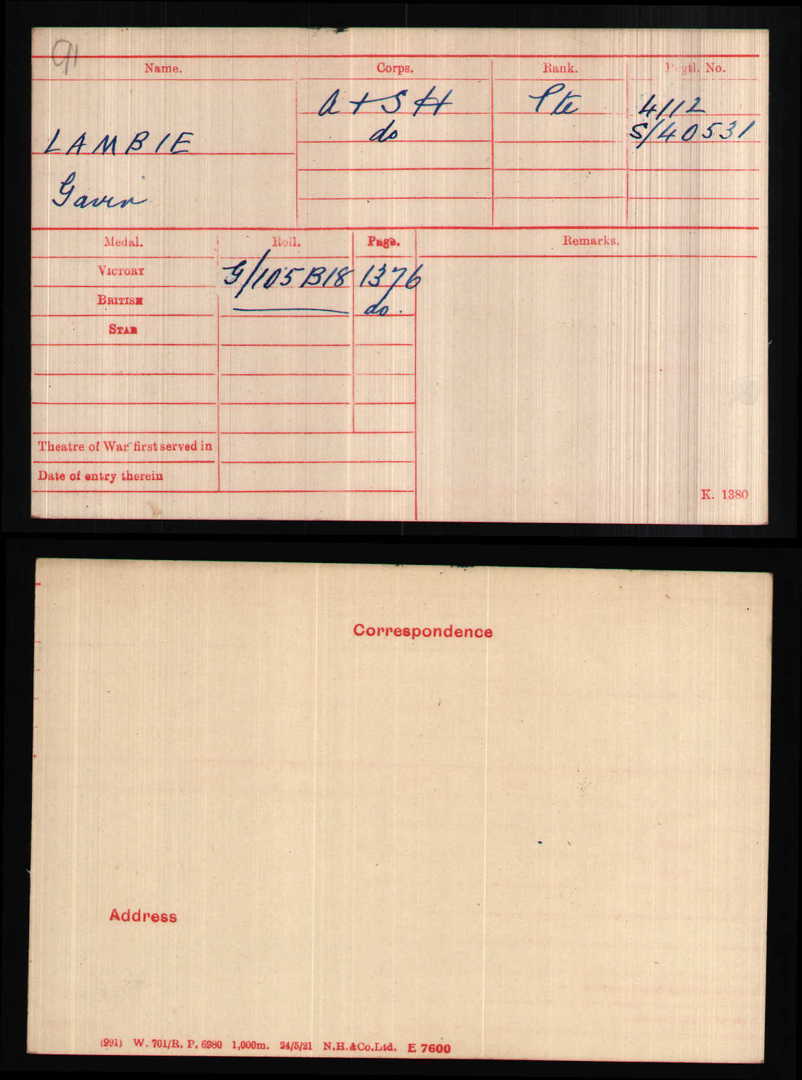 The Medal Rolls Index Card (MIC) for GAVIN shows that he was awarded The Victory Medal and The British War Medal. The MIC is undated, which indicates that he went to France after 1915.