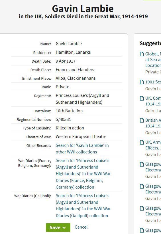 The entry in Soldiers Died in the Great War (SDGW) shows that GAVIN lived in Hamilton, and enlisted in Alloa, Clackmannanshire.