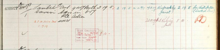 The "Soldier's Effects" record shows that his widow Janet received his Outstanding Pay of £2/19/5, and a War Gratuity of £8/10/-.
