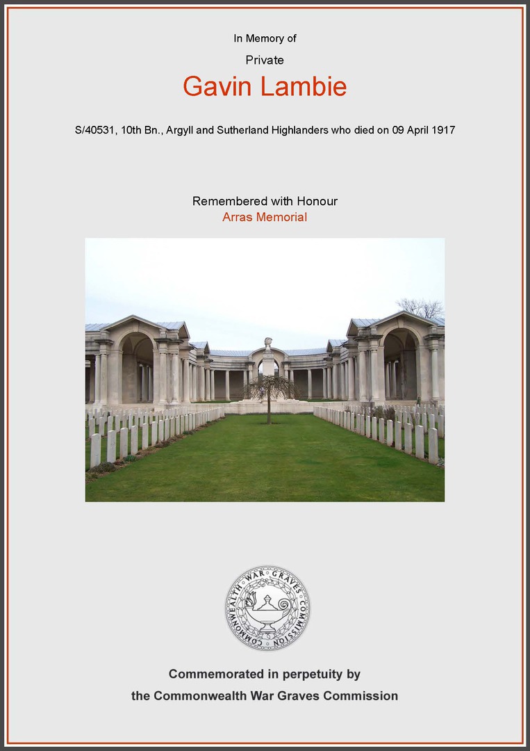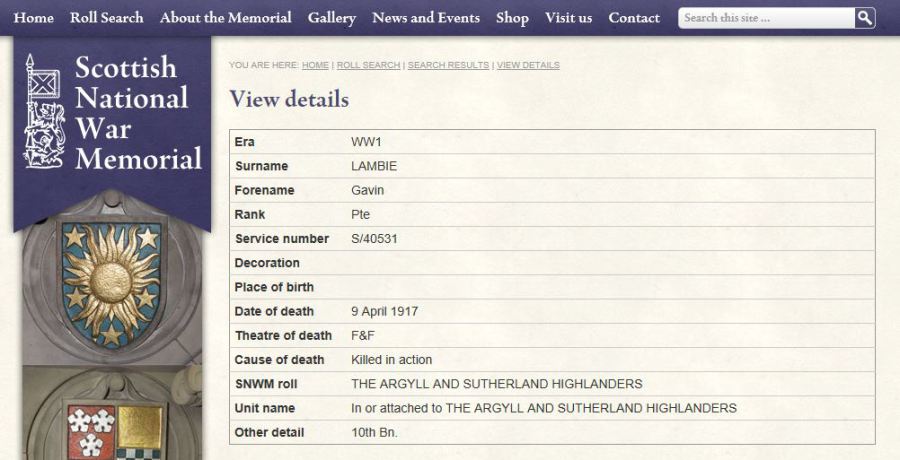 GAVIN LAMBIE, Private S/40531, 10th Battalion, Argyll and Sutherland Highlanders, is NOT named on the Larkhall War Memorial.
