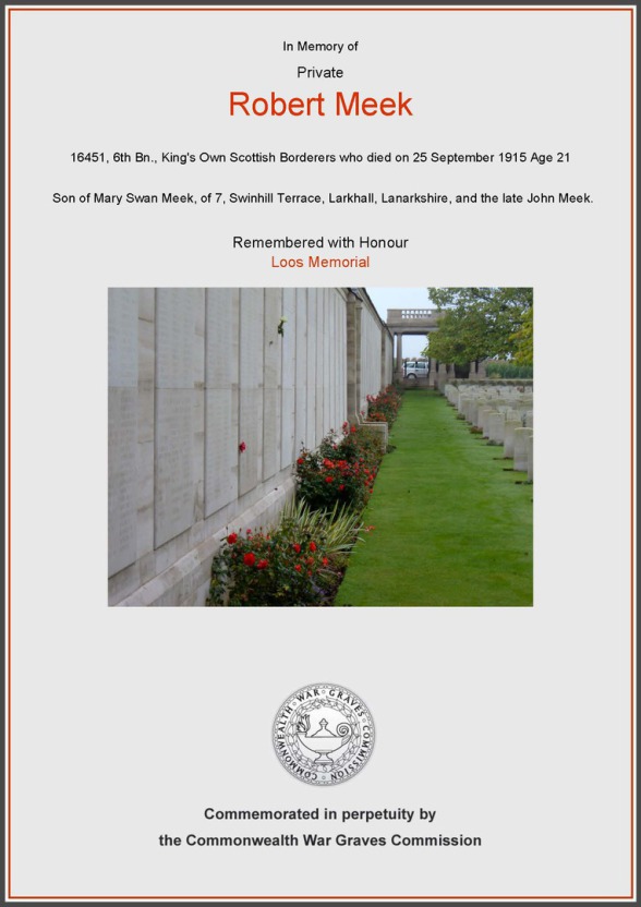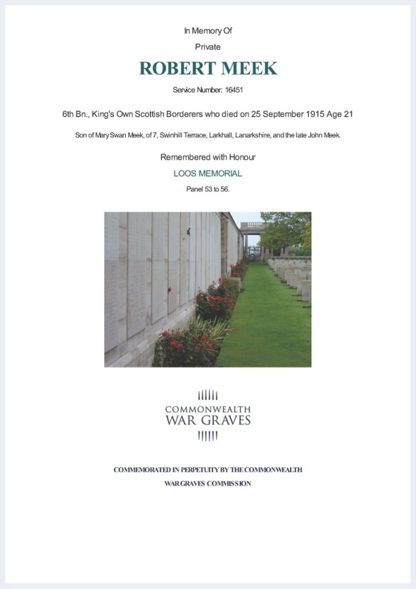 ROBERT MEEK, Pte 16451, 6th Bn, KOSBs, is NOT named on the Larkhall War Memorial.