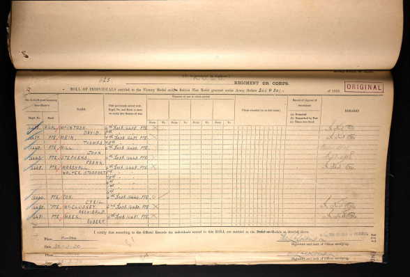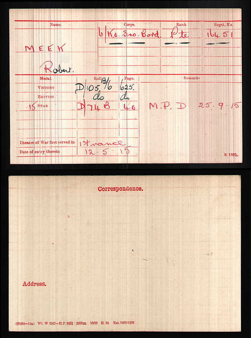 The Medal Rolls Index Card (MIC) for ROBERT shows that he was awarded The 1914-15 Star Medal, The Victory Medal and The British War Medal.