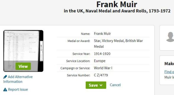 UK, Naval Medal and Award Roll for FRANK MUIR.