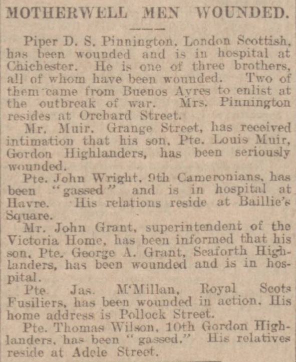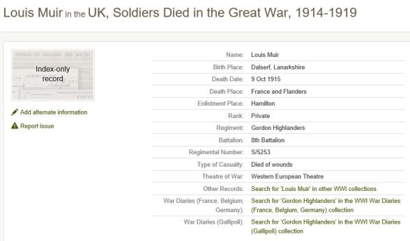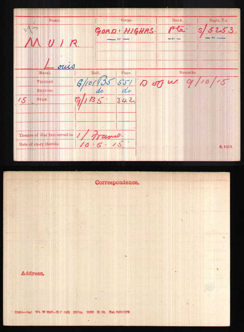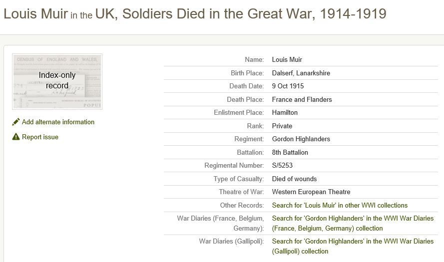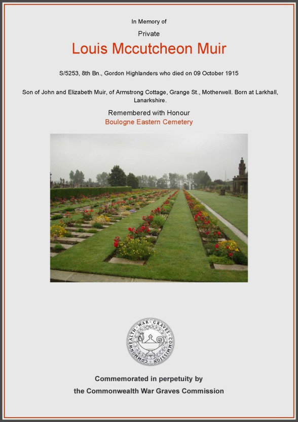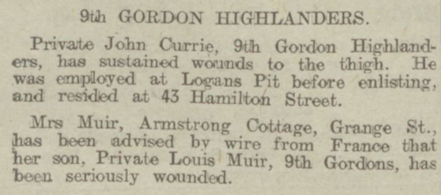 Mrs Muir, Armstrong Cottage, Grange St., has been advised by wire from France that her son, Private Louis Muir, 9th Gordons, has been seriously wounded".