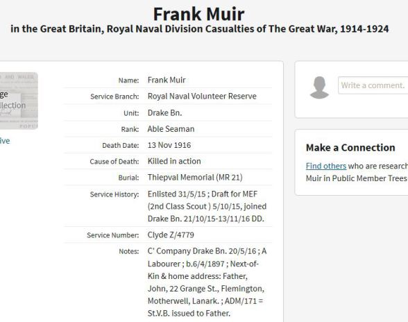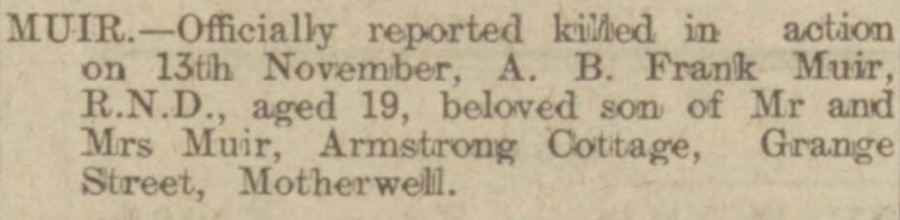 "MUIR - Officially reported killed in action on 13th November, A.B. Frank Muir, R.N.D., aged 19, beloved son of Mr and Mrs Muir, Armstrong Cottage, Grange Street, Motherwell".