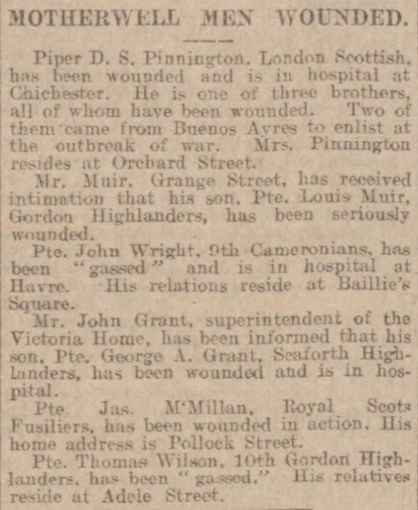 A newspaper clipping taken from The Motherwell Times, page 5, dated 1st December, 1916, reads: