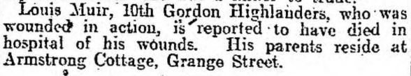 "Louis Muir, 10th Gordon Highlanders, who was wounded in action, is reported to have died in hospital of his wounds. His parents reside at Armstrong Cottage, Grange Street".