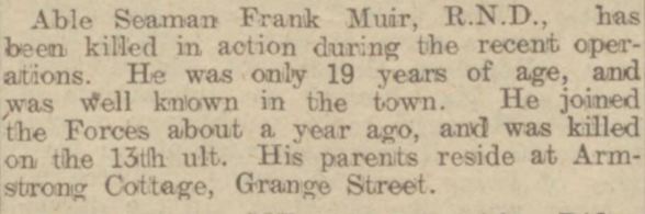 "Able Seaman Frank Muir, R.N.D., has been killed in action during the recent operatons. He was only 19 years of age, and was well known in the town. He joined the Forces about a year ago, and was