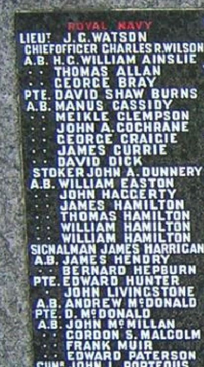 Panel of Motherwell War Memorial showing Able Bodied Seaman FRANK MUIR.