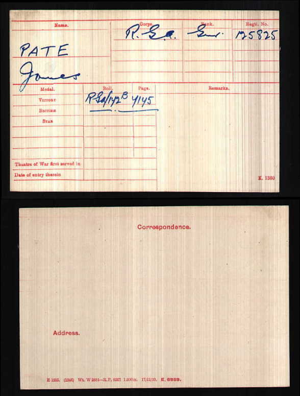 The Medal Rolls Index Card (MIC) for JAMES PATE shows that he was awarded The Victory Medal and The British War Medal. The MIC is undated, which indicates that he went to France after 1915.