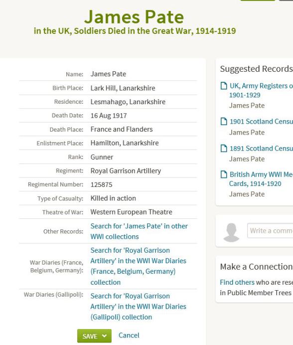 The entry in Soldiers Died in the Great War (SDGW) shows that JAMES PATE was born in Lark Hill [sic], Lanarkshire, lived in Lesmahago [sic], Lanarkshire, and enlisted in Hamilton.