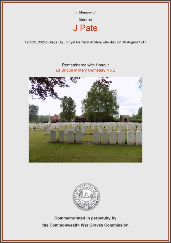 The Commonwealth War Graves Commission (CWGC) entry for JAMES PATE shows that he is buried at LA BRIQUE MILITARY CEMETERY NO 2, West Vlaanderen, Belgium. There are 456 identified casualties buried at LA BRIQUE MILITARY CEMETERY NO 2.