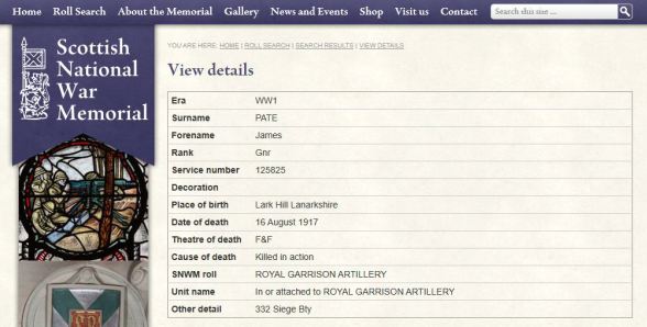 JAMES PATE is commemorated at The Scottish National War Memorial (SNWM) in Edinburgh Castle.
