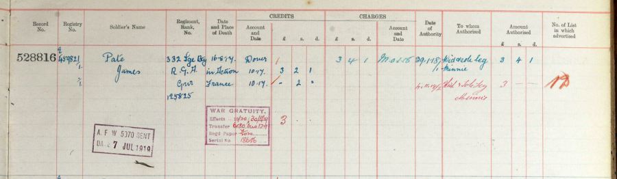 The "Soldier's Effects" record shows that his widow Minnie received his Outstanding Pay of £3/4/1, and a War Gratuity of £3/-/-.