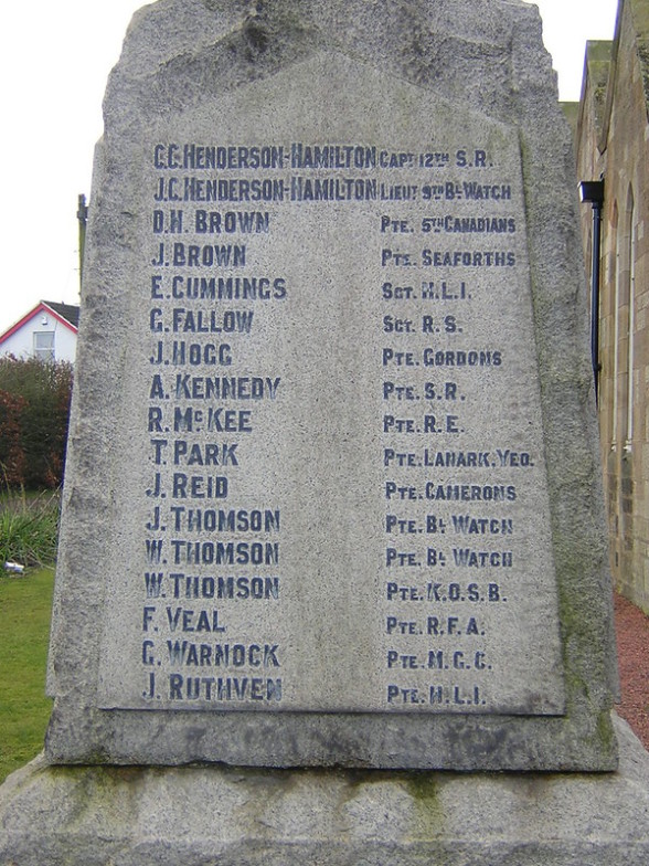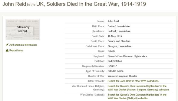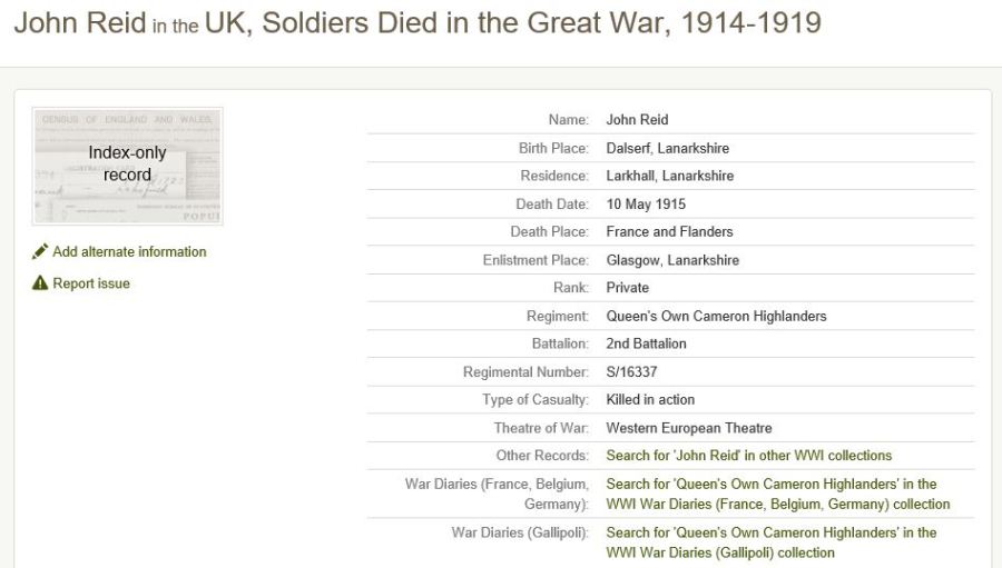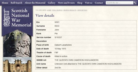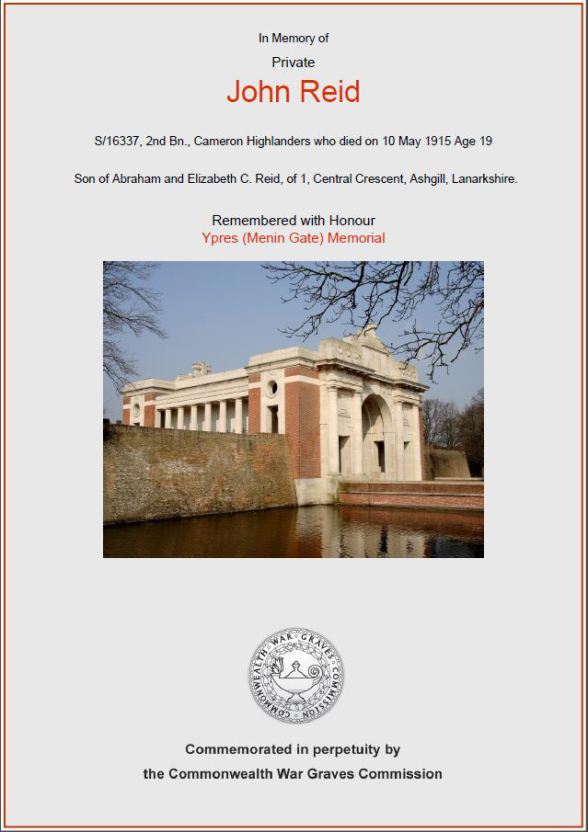 JOHN REID, Private S/16337, 2nd Battalion, Cameron Highlanders, is NOT named on the Larkhall War Memorial. He is listed on Dalserf War Memorial, Ashgillhead, Ashgill.