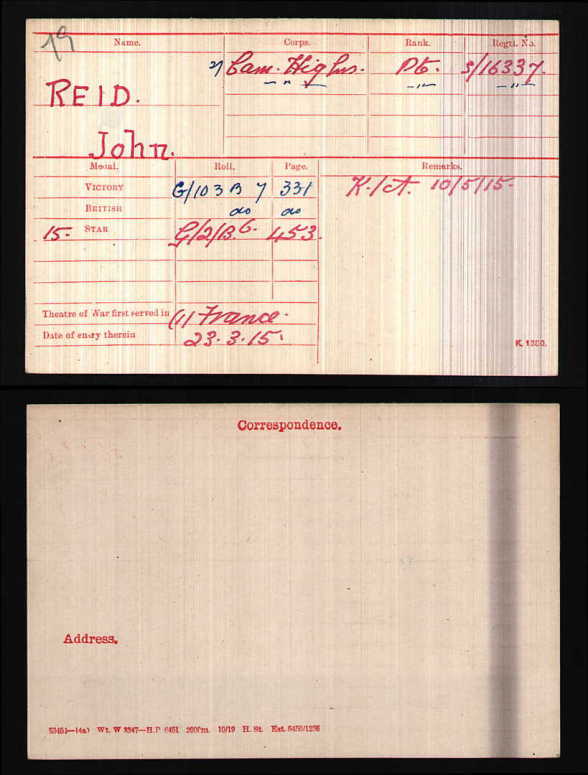 JOHN REID joined the 2nd Battalion, Cameron Highlanders, as Private S/16337, and went to France on 23rd March, 1915.