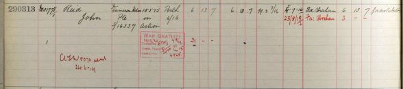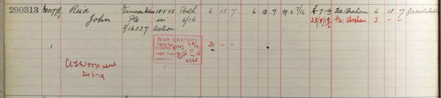 The "Soldier's Effects" record shows that his father Abraham received his Outstanding Pay of £6/13/7, and a War Gratuity of £3/-/-.