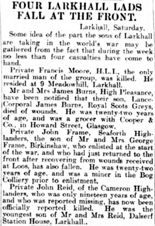 Private John Reid, of the Cameron Highlanders, who was only nineteen years of age, and who was reported missing, has now been officially reported killed. He was the youngest son of Mr and Mrs Reid,