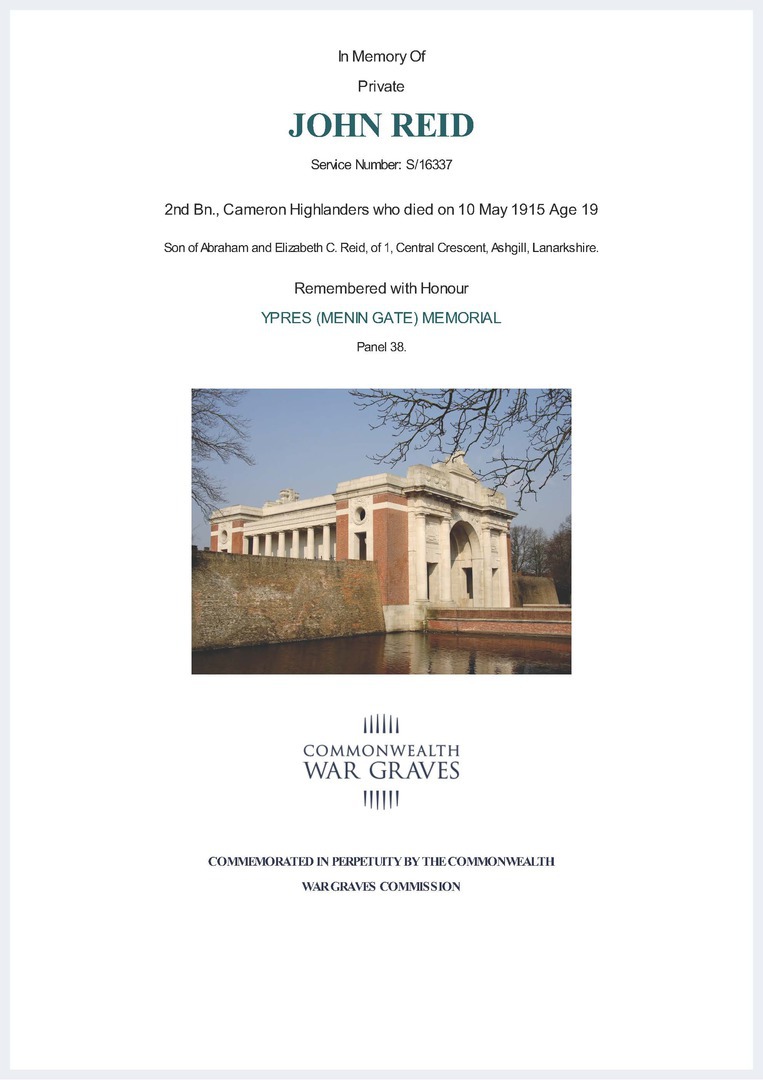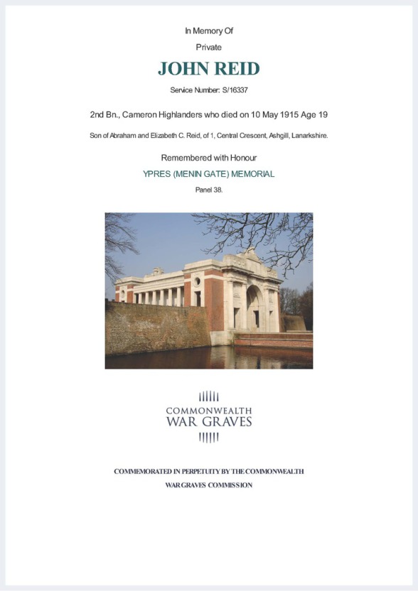 JOHN REID was Killed-In-Action on 10th May, 1915, age 19.