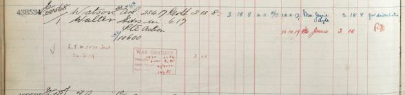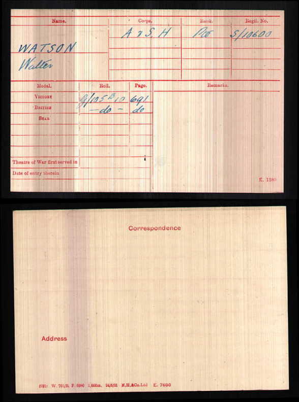 The Medal Rolls Index Card (MIC) for WALTER WATSON shows that he was awarded The Victory Medal and The British War Medal. The MIC is undated, which indicates that he went to France after 1915.