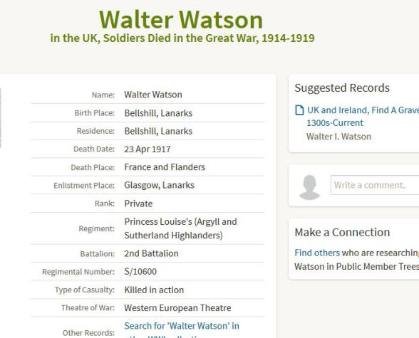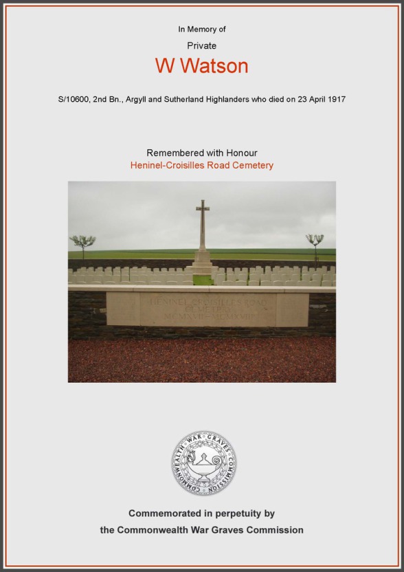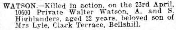"WATSON - Killed in action, on the 23rd April, 10600 Private Walter Watson, A. and S. Highlanders, aged 22 years, beloved son of Mrs Lyle, Clark Terrace, Bellshill".