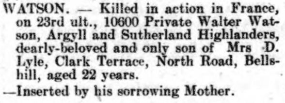 "WATSON - Killed in action in France, on 23rd ult., 10600 Private Walter Watson, Argyll and Sutherland Highlanders, dearly-beloved and only son of Mrs D. Lyle, Clark Terrace, North Road, Bellshill,