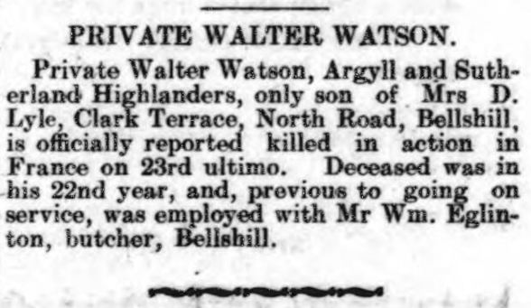Private Walter Watson, Argyll and Sutherland Highlanders, only son of Mrs D. Lyle, Clark Terrace, North Road, Bellshill, is officially reported killed in action in France on 23rd ultimo. Deceased was