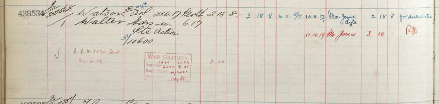 The "Soldier's Effects" record shows that his mother Jessie received his Outstanding Pay of £2/18/8 and a War Gratuity of £3/10/-.