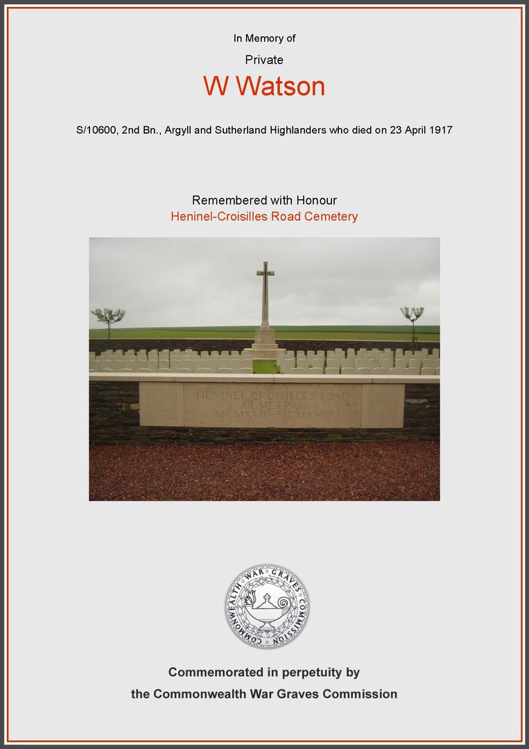 The Commonwealth War Graves Commission (CWGC) entry for WALTER WATSON shows that he is buried at HENINEL-CROISILLES ROAD CEMETERY, Pas de Calais, France. There are 212 identified casualties buried